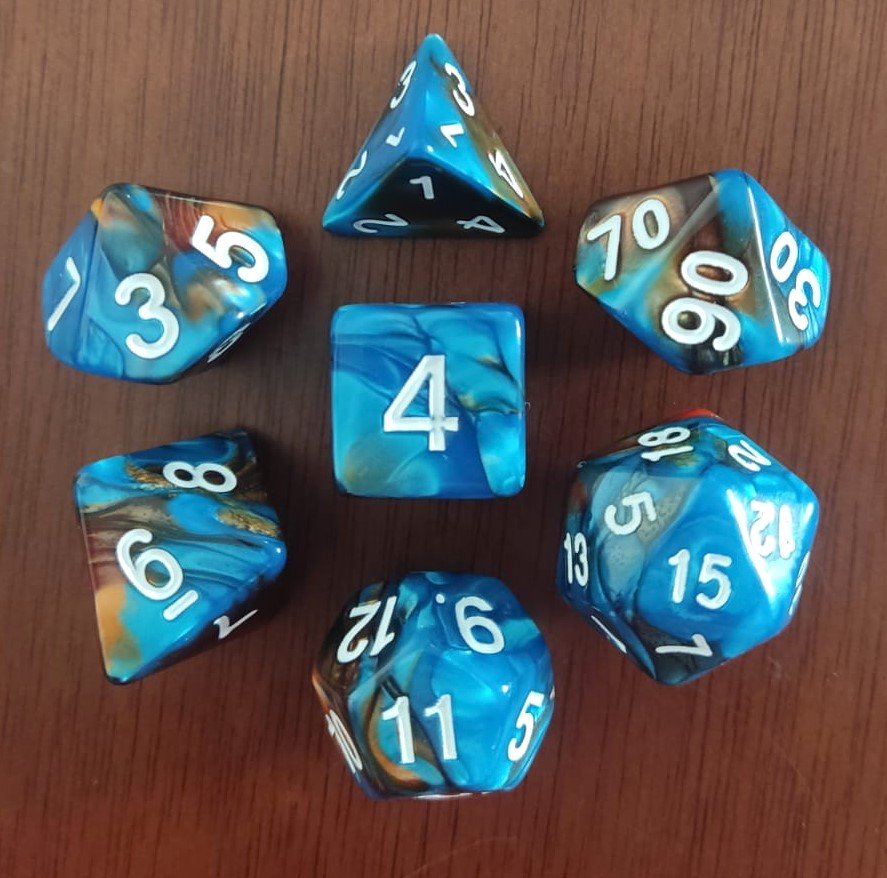 O conjunto contém 7 dados: D20, D12, D10, D%, D8, D6, D4