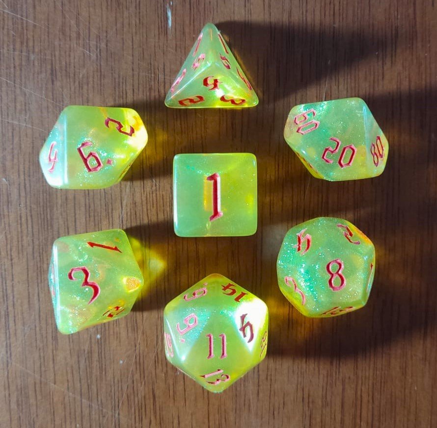 O conjunto contém 7 dados: D20, D12, D10, D%, D8, D6, D4